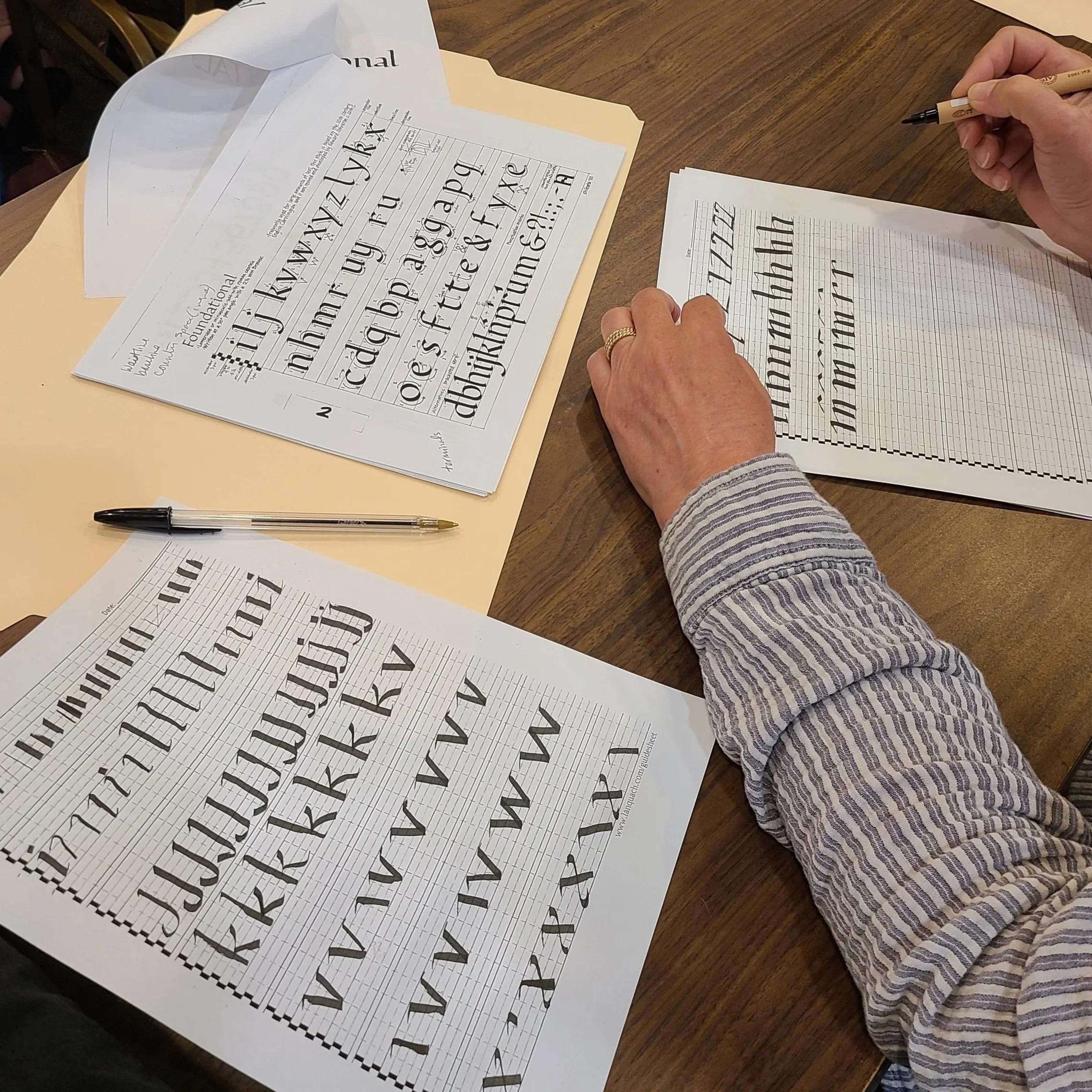 Learn how to draw the basic foundational letter shapes, which you can use to embellish handmade books, greeting cards, envelopes, tags, bookmarks, notes, etc. Extremely legible, the foundational hand serves as a model for many contemporary lettering and typefaces — and often to cover big spaces too. This half-day workshop will also include a short demonstration of the various traditional tools used in calligraphy, plus lots of time for guided practice with the foundational writing style. All levels welcome.